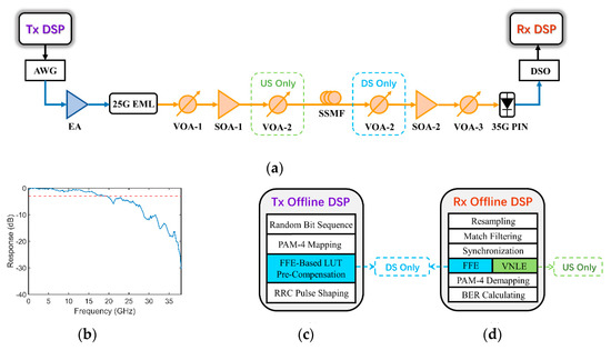(a) Experimental setup for 100 Gb/s/λ PAM-4 PON; Frequency response of the system (b); Tx (c) and Rx (d) side offline DSP flow, respectively.