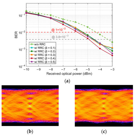 The offline DSP flow chart at the Tx is shown in Figure 2c. The gray-mapped PAM-4 symbols are obtained from a random bit sequence generated by the Mersenne twister algorithm to get more convincing bit-error-ratio (BER) results [24]. For downstream transmission, the PAM-4 signal is pre-compensated by an FFE-based LUT on the OLT side. While for upstream transmission, no pre-compensation or pre-equalization is used. Since the bandwidth limitation of the transceiver devices can cause ISI, Nyquist pulse shaping based on root-raised-cosine (RRC) filter is adopted with the optimal roll-off factor 0.4. The BER performance for different roll-off factors under the back-to-back (BtB) and without SOA case is shown in Figure 3a. Figure 3b,c show the electrical eye diagrams of 50 Gbaud PAM-4 signal before and after RRC.