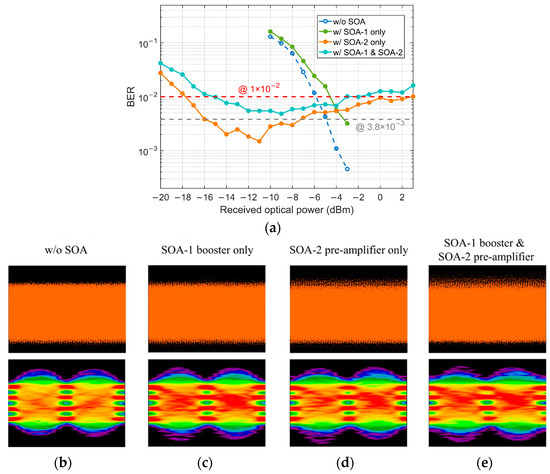 (a) BER performance under four conditions: without SOA, with SOA-1 only, with SOA-2 only, and with both SOA-1 and SOA-2; (b–e) Corresponding receiver time-domain signals and FFE recovered eye diagram at −3 dBm ROP.