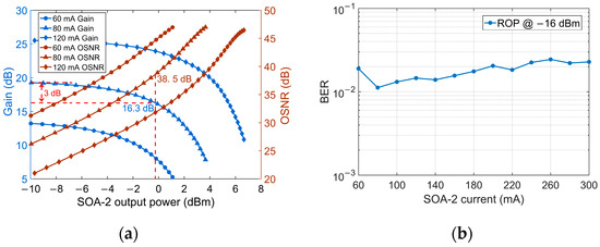 For optimizing the performance of SOA-2 as a pre-amplifier, the SOA gain and optical signal-to-noise ratio (OSNR) of 50 Gbaud PAM-4 signal versus optical output power with different bias currents are measured and shown in Figure 5a. For the 60 mA bias current, despite the high OSNR, the SOA gain is not high enough to support a high input power of PIN when the ROP is low, which will result in poor BER performance. Considering higher bias current induces higher amplified spontaneous emission (ASE) noise [25], the SOA-2 bias current is finally optimized to 80 mA with −0.2 dBm and corresponding −16.5 dBm saturated input power to strike a balance between the gain and OSNR. Figure 5b shows the BER versus SOA-2 bias current under the BtB test at −16 dBm ROP. Varying the bias current from 80 mA to 300 mA, the BER shows an increasing trend.