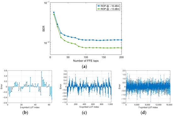 For the downstream link, we firstly investigate the required number of FFE taps at the Rx side. As shown in Figure 6a, the BER performance is improved as the number of taps is increased but stabilizes when the number exceeds 100. So we fix the number of FFE taps to 100 in the following experiments. Afterward, under the condition that the training sequence length of LUT is 100,000, we use this FFE to generate three LUTs with different memory lengths—3, 5 and 7, respectively, and the generated LUTs are presented in Figure 6b–d.