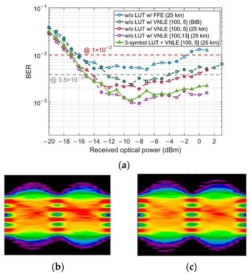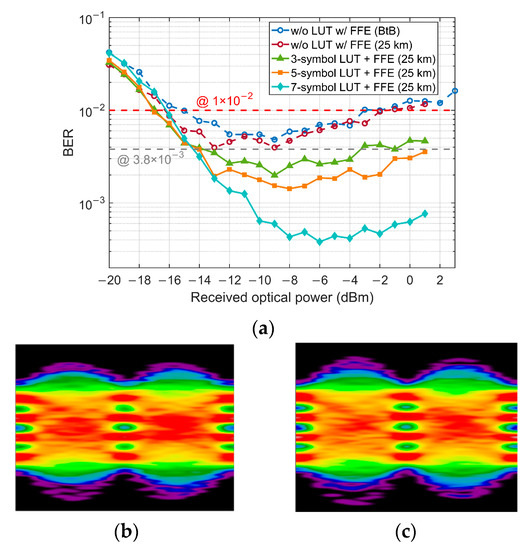 Figure 7a depicts the BER performance with FFE-based LUT pre-compensation. Since the O-band has a very low CD coefficient, the system performance is hardly degraded by CD in a short distance (e.g., 25 km) SSMF transmission. Besides, for a short distance and low launch power, the fiber nonlinearities can also be neglected. It is worth noting that contribution to the interaction between CD and chirp effects of the modulator. The BER performance is slightly improved after 25 km transmission compared with the BtB case. To better mitigate the pattern effect, the calibration ROP point is chosen to −8 dBm where the pattern effect is strong, and the BER is lower than the SD-FEC threshold (1 × 10−2). As the results shown in Figure 7a demonstrate, thanks to larger memory length, the 7-symbol LUT has a much stronger performance to mitigate the pattern effect than 3- and 5-symbol LUT. However, owing to the large error value stored in 7-symbol LUT, it has a potential risk of sensitivity penalty. Moreover, its higher calculation complexity and huge memory requirement make it difficult to be implemented practically. Notice that for 3- and 5-symbol LUT combined with FFE, a 0.8 dB receiver sensitivity improvement is obtained compared with FFE only and the combination of 7-symbol LUT and FFE. Therefore, a 3 or 5-symbol LUT will be a better choice to trade off the performance and complexity. However, for the SD-FEC threshold, 3- and 5-symbol LUTs have the same performance of sensitivity and dynamic range, so 3-symbol is finally chosen in our experiment. Figure 7b,c show the eye diagrams after 25 km SSMF transmission with 3- and 5-symbol LUT pre-compensation and post FFE, respectively, and the ‘eye’ between levels ‘2’ and ‘3’ is clearly open.