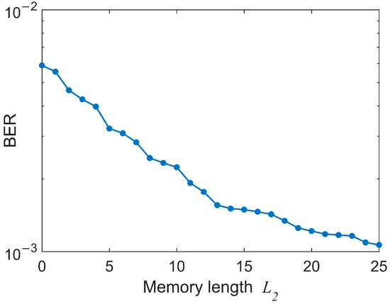 For upstream direction, considering the memory requirement and computational complexity, we did not apply LUT at the transmitter of the ONU. In this case, simple linear FFE at the Rx will result in a limited dynamic range. Therefore, a nonlinear VNLE is utilized at the receiver of the OLT instead. For the 2nd-order VNLE, we continue to use the optimized FFE as its linear part. Similarly, we measure the BER performance versus the memory length L2 of VNLE with L1 fixed to 100 at −8 dBm ROP. As depicted in Figure 8, the BER decreases as we increase L2. Yet, good receiver sensitivity and dynamic range can be achieved when L2 = 5 in consideration of the SD-FEC threshold. Figure 9a shows the results of L2 = 5 and L2 = 13 for comparison. So L2 is finally set to 5.