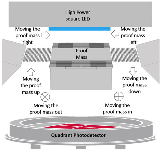 It is expected that there will be some additional errors due to the misalignment between the three parts of the accelerometer in the range of 1–2 µm. This may happen due to misalignment of chips’ assembly and bonding by the wafer bonder. Such expected misalignment values are very tolerable as the area of the LED is 1 mm × 1 mm, the proof mass is also 1 mm × 1 mm and each quadrant of the detector is 1.44 mm × 1.44 mm. Moreover, some errors may come from the scattering of light from the springs’ surface and device walls. However, these errors are not expected to hinder the device’s performance as they can be calibrated during device testing and subtracted from the signal.
