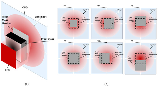(a) Isometric drawing of the optical concept of the accelerometer. (b) The shadow position moves with the proof mass position and the optical power received by each quadrant of the QPD changes. The dimensions are not to scale.
