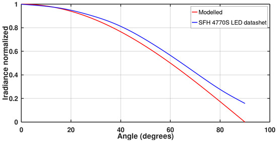 Comparison between the angle irradiance relation from the SFH 4770S LED’s datasheet and the modelled characteristics.