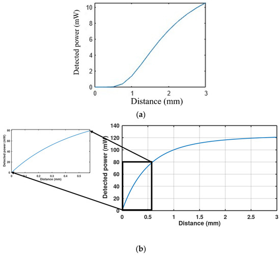 For selecting a suitable LED source to achieve good performance, there are some parameters to consider such as the irradiance and the spreading angle of the light. The narrow-angle LED is not good for the proposed accelerometer because it shows a very small slope (sensitivity) in the detected-power versus vertical distance curve for small vertical distance values. As shown in Figure 6a, which describes the behavior of a square LED with a 15° half-angle, the slope of the curve is flat until the distance between the LED and the proof mass becomes higher than 1 mm. This will require a big footprint of the device to get a good vertical sensitivity. Moreover, most narrow-angle LEDs in the market are low-power LEDs, which further decreases the sensitivity. On the other hand, wide-angle LEDs show a good vertical sensitivity at very small distances. Moreover, there are many wide-angle LEDs in the market with irradiance power higher than 1 W. For a square LED with 60° half-angle (SFH 4770S), the sensitivity is maximum and approximately linear when µm as, shown in Figure 6b. Thus, the proof mass should be placed at a distance smaller than 600 µm from the LED. Note that the LED is used in the system as a chip without packaging so that the distance can be controlled. Then the entire system can be packaged together after chips’ assembly and bonding by a wafer bonder.
