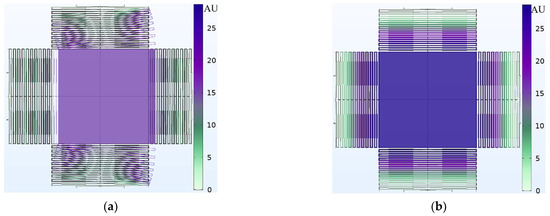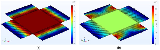 Before discussing the simulation of the MEMS part, its dimensions should be mentioned. The proof mass and total chamber dimensions are 1 mm × 1 mm and 2 mm × 2 mm, respectively; the dimensions of the proof mass and springs are shown in Figure 2a. The thickness of the proof mass is 25 µm and the wafer thickness is about 400 µm.