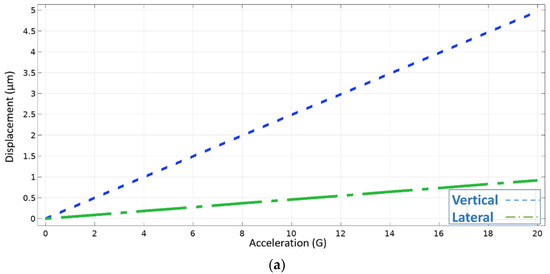 Figure 8 plots the relation between applied acceleration and the proof mass displacement in both vertical and lateral movement for the three designs. The mechanical sensitivities of the three spring designs are the slope of the graphs shown in Figure 8. Sensitivity for design 1 is small as expected and found to be, only, 0.25 µm/G for the vertical movement, which is given the symbol (), and 0.05 µm/G for the lateral movement, which is given the symbol (). While sensitivity for design 2 is 3.7 µm/G for the vertical movement, and 2.5 µm/G for the lateral movement, which is more than 50 times the sensitivity of design 1. As for design 3, the sensitivity is 1.4 µm/G for the vertical movement and 1.8 µm/G for the lateral movement, which represents a trade-off between the other two designs as explained earlier.