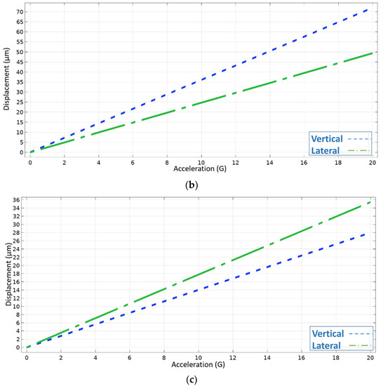 The relation between displacement and applied acceleration for each design is shown. The slope of each graph represents the vertical and lateral mechanical sensitivity of the three proposed optical accelerometer designs: (a) Design 1, (b) design 2, (c) design 3.