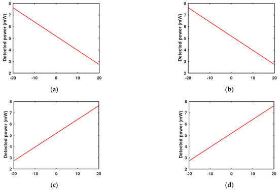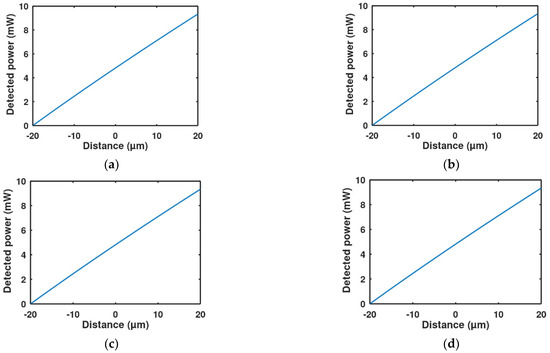 Detected power change with the lateral movement for each quadrant of the QPD: (a) The left upper quadrant, (b) the right upper quadrant, (c) the left lower quadrant, (d) the right lower quadrant.