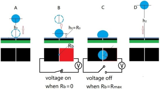 Figure 2 shows the schematic diagram for the EW-actuated droplet trampolining. The droplet initially rests on the substrate with its centroid projection falling on the gap between the electrodes (applying a voltage of a few volts can help position the droplet on the gap due to energy minimization principle discussed later). A voltage pulse is first applied to the electrodes and induces the droplet to jump to a height h1 (A), when it falls and touches the substrate (electrodes), the pulse (voltage) is applied to the electrodes again (B) to enhance the spreading of the droplet. The pulse continues until the spherical-cap-shaped droplet spreads to its maximum base radius (Rb), and then, the pulse is switched off. This is because under a fixed amplitude of the voltage, a longer pulse does not necessarily lead to a larger spreading of the droplet due to oscillation of the droplet (for this, please see the droplet spreading under different pulse duration in File S3 of the Supplementary Material). The droplet then recoils under surface tension and jumps to a larger height h2 (D). The actuation cycle is repeated, and the droplet shows a trampolining behavior on the superhydrophobic surface.
