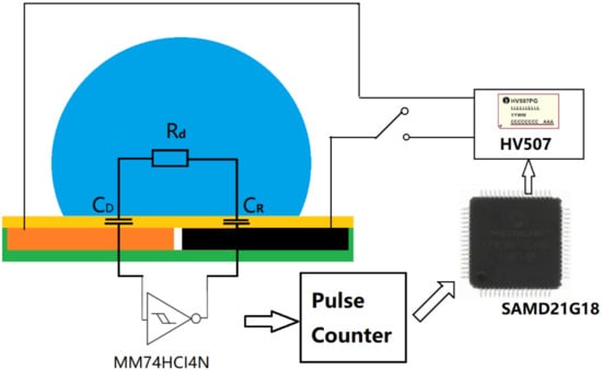 As shown in Figure 3, the capacitor sensor-based feedback system works in the following manner. A microcontroller Atmel SAMD21G18B-A outputs low analog voltage (0–5 V) through a low voltage serial to high voltage parallel converter (HV507) with microcontroller SPI interface. The pulse counter port in the microcontroller is connected with a ring oscillator which measures capacitance on the electrodes, which is also controlled by the microcontroller. By using a fast 20 MHz microcontroller, one cycle of sensing and driving can be completed within 1 ms [33].