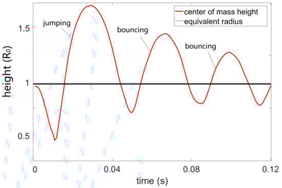 where denotes the energy lost via various forms such as internal viscous damping and contact line friction. Figure 4 shows the centroid position as a function of time during the EW-induced jumping motion where an AC voltage of 300 V is applied between the electrodes and a spherical droplet with equivalent radius of ~0.85 mm (movie 1 in Supplementary Material). After turning off the voltage, the droplet jumps to a height of ~1.7 . The droplet continues to bounce off the substrate after impacting the surface, showing a restitution coefficient of ~0.89.