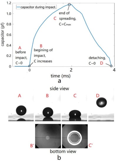 Evolution of the droplet capacitance value during the impacting process (a) and the corresponding droplet images at the distinct turning point (b). A, B, C and D indicate that the droplet levitates in the air, impacts the substrate, spreads to maximum base radius and leaves the substrate. Note Figure 5b also shows the bottom-view images corresponding to B and C.