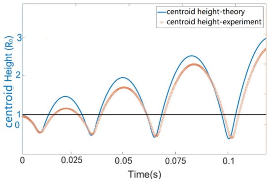 With the values of , and the expression for , the solution to Equations (8) and (10) (according to the third to fifth row of Equation (11)) is plotted in Figure 6 together with the experimental data. Except for a discrepancy between the jumping height, a good agreement is found between the two. As to the effect of voltage level on the trampolining height, it is natural that they should follow a similar trend as reflected by File S4 of the Supplementary Material, which should also agree with the prediction of the trampoline model discussed before, since a larger voltage level represents a larger driving force F’ according to Equations (1) and (9). Therefore, this part of the work is skipped here. For a discussion on the velocity and acceleration of the droplet, please refer to File S5 of the Supplementary Materials.