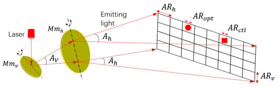 Typically, the angular resolution of a MEMS-based LiDAR system depends on two aspects. One aspect is the control angular resolution of the MEMS mirror (), which is related to the driving [,,] and feedback control [,,] of the MEMS mirror itself. In the current MEMS-based LiDAR system, the  is usually controlled under 0.2° in terms of the optical scanning amplitude of the MEMS mirror. The other aspect is the optical resolution (), which mainly depends on the divergence angle of the laser. Due to the millimeter scale of the MEMS mirror, a complicated collimation lens design is generally required to suppress the laser divergence angle [,,]. In order to demonstrate the angular resolution in the separate-axis Lissajous scanning MEMS-based LiDAR system in detail, Figure 1 is depicted below. Here,  represents the vertical scanning MEMS mirror, and  represents the horizontal scanning MEMS mirror.  means the vertical optical scanning angle, and  is the horizontal optical scanning angle. In Figure 1,  is the horizontal angular resolution, and  is the vertical angular resolution.  represents the optical angular resolution, and  represents the control angular resolution.
