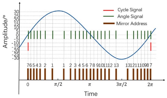 To achieve 2D scanning, the cycle signal and angle signals of the  and the  are all needed to confirm the position of each pixel. To obtain an accurate angular resolution, the angle signals of the  and the  are encoded as the vertical scanning mirror moving address () and the horizontal scanning mirror moving address (), as shown in Figure 2. In this way, the position of each pixel is only defined by the mirror angular address consisting of the  and . Additionally, the laser pulse can be triggered at different angular addresses to achieve a reconfigurable angular resolution. It should be noted that the encoded mirror moving address is not continuously in one scanning period of the uniaxial MEMS mirror. Due to the harmonic motion, the same trajectory is scanned twice in one scanning period of the uniaxial MEMS mirror. In this case, the cycle signal represents the 0 degree of the optical scanning angle and thus the exact middle position of the scanning trajectory. Thus, the first angle signal is encoded as address 7 in the condition of a 5° angular resolution and a 60° optical scanning angle. Similarly, when the time is  or , the encoded address is address 1 or 13, which represents a 30° optical scanning angle. Then, the vibration position signals of the  and the  are all encoded as the angular addresses accorded with the angular resolution. A reconfigurable angular resolution can be achieved by emitting laser pulses at the different angular addresses.