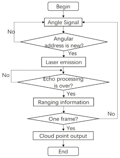 In fact, more aspects need to be considered in the procedure of realizing the reconfigurable angular resolution. At first, due to the scanning form of Lissajous, some pixel positions may be scanned repeatedly in one frame rate. In order to utilize the laser duty cycle effectively, the laser pulse should be prevented from hitting those pixels with the same angular address. Secondly, due to the varying scanning speed of Lissajous scanning at different pixel positions, the processing time of the echo signal  should be considered, and the laser pulse should be triggered after the echo processing is over. Based on the above, the entire realization process of the design method on the angular resolution in the separate-axis Lissajous scanning MEMS LiDAR system is depicted in Figure 3. As shown below, the angle signal of the  or the  can be firstly detected in the ranging procedure. Then, it should be distinguished whether the angular address is repeated or not. If not, the laser pulse can be triggered, and the echo processing unit starts to work. The new angle signal should not be judged until the ranging process is finished. Then, the ranging information of the target can be obtained, including the angular address and detected distance. When all of the unrepeated angular addresses have been detected, the cloud point data of a whole frame can be transmitted to the software to display. Through this design method, reconfigurable angular resolutions can be achieved in the separate-axis Lissajous scanning MEMS LiDAR system.