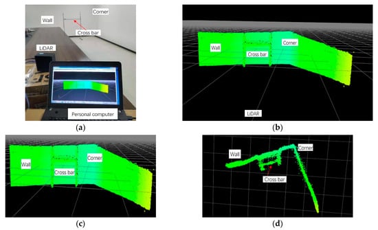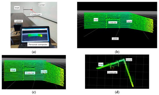 (a) Picture of the experiment of the angular resolution of 0.2° × 0.15°, (b) panorama of the cloud point, (c) front view, and (d) top view.