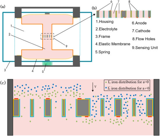After the voltage was applied for a period of time, positive and negative reactions reached an equilibrium, and a stable starting current was maintained in the solution and the external circuit. When there was no external vibration, the ion concentration distribution around the two pairs of electrodes was symmetrical, and the output current was the difference between the two cathode currents equal to 0. When external vibration occurred, the electrolytes flowed relative to the sensing unit, and the velocity field could be described by the Navier–Stokes equation of incompressible fluid [].