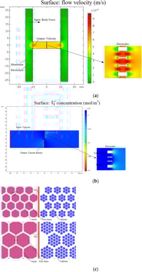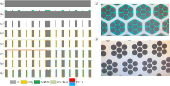 (a) A silicon wafer with a thickness of 200 μm was selected and thoroughly washed in boiling sulfuric acid and deionized water; (b) a mask of patterned AZ4620 photoresist for etching was formed on one side of the silicon wafer by photolithography; (c) the patterned silicon wafer was etched by deep reactive ion etching (DRIE) to form flow holes (Chamber pressure: 10 Pa; Gas: SF6 450 sccm, C4F8 150 sccm; Power: Upper electrode 2500 W, Lower electrode 1500 W; Cycle: 170), and then the silicon wafer was cleaned with acetone, alcohol solutions, and deionized water to remove residual photoresist and other impurities; (d) a 1 μm-thick uniform silica insulating layer was formed on the surface of the silicon wafer by thermal oxidation (under 1080 °C); (e) a patterned dry film mask was formed on one side of the silicon wafer by lithography to transfer the electrode pattern to the silicon wafer; (f) on this side, 400 angstroms-thick Ti and 2500 angstroms-thick PT were sputtered successively (Chamber pressure: 6 × 10−6 Torr; Gas: Ar 35.5 sccm); (g) the anode of one pair of electrodes and the cathode of the other pair of electrodes were prepared simultaneously by lift-off; (h) repeated steps (e–g) on the other side of the silicon wafer to prepare the remaining two electrodes.