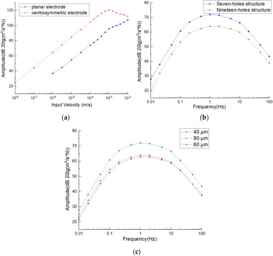 Simulation results: (a) output current vs. input velocity of the electrochemical seismic sensors based on the integrated structure of four centrosymmetric micro electrodes vs. four planar micro electrodes. Amplitude frequency responses of the electrochemical seismic sensors based on the integrated structure of four centrosymmetric micro electrodes with variations in arrangements of flow holes (b) and anode width (c).