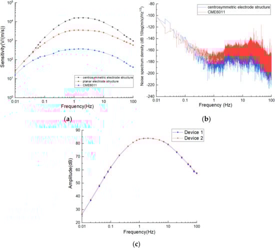 Characterization results: (a) amplitude frequency response and (b) noise spectrum densities of the electrochemical seismic sensor based on the integrated structure of four centrosymmetric micro electrodes, in comparison to the commercial counterpart of CME6011 and the electrochemical seismic sensor based on the integrative structure of four planar micro electrodes. (c) amplitude frequency response of two electrochemical seismic sensors based on the integrated structure of four centrosymmetric micro electrodes.