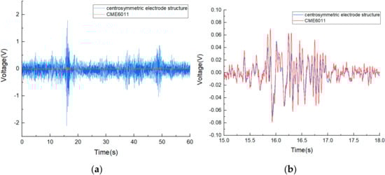 In order to further characterize the performance of the proposed electrochemical seismometer, it was placed side by side with CME6011 to monitor random vibration. Figure 7a shows the random vibration response of electrochemical seismic sensors based on the integrative structure with four centrosymmetric electrodes and the commercial counterpart of CME6011. It can be seen from the figure that since the sensitivity of the seismic sensor developed in this study was higher than CME6011, the outputs of this study were significantly higher than CME6011 under the same random vibrations. After the outputs were normalized, comparable results of the two seismic sensors from 15 s to 18 s were shown in Figure 7b, where high correlations were located, validating the performance of the seismic sensor based on the four centrosymmetric electrodes.