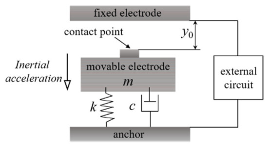 Schematic diagram of the spring (k)–mass (movable electrode m)-damping (c) system model of a uniaxial inertial switch. y0 means the initial distance between the movable electrode and the fixed electrode.