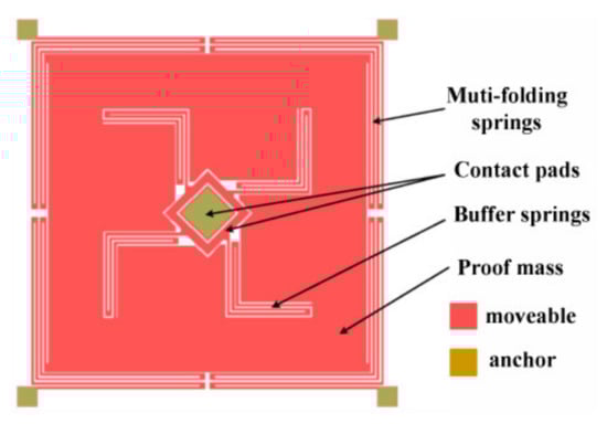 An inertial switch with biaxial sensitivity means that it can operate in two axes. There are two main methods to achieve biaxial directional sensitivity for the switch. One of the ways is to assemble two single-axial switches into one chip, and the new switch can realize biaxial sensitivity in a plane [43]. Although the direct assembly of single-axis switches improves the directional sensitivity, it also has some problems and defects, including assembly errors [44], excessive bulk [45], packaging difficulty [46], and high manufacturing costs [45]. Another method is to utilize multiple springs to support the mass, and the fixed electrode is placed around the mass in multiple directions to achieve biaxial sensitivity. That layout allows a more uniform distribution of the stiffness of the mass–spring system in all directions. Greywall et al. [47] claimed patents for two biaxial inertial switch designs. Both designs had a circular proof mass suspended by springs, but varied in the fact that the fixed electrodes were outer and inner. Lin et al. [48] presented another design of a two-axis low-g acceleration threshold switch. The switch utilized buffer springs connected to the proof mass and contacted the fixed electrode, which would reduce the bounce of the switch when the shock exceeded the acceleration threshold, thereby prolonging the contact time of the switch, as illustrated in Figure 3. Niyazi et al. [49] designed a novel bidirectional multi-threshold mems inertia switch capable of acceleration-based actuation of separate circuits. The design implemented a spring-suspended mass with fixed electrodes positioned in the sensitive direction, consuming no power in the stationary state. The acceleration thresholds were 69 g and 121 g. Xu et al. [50] fabricated a dual-axis MEMS shock sensor that could be triggered in each direction in a single plane. The device consisted of a movable electrode, which was a proof mass suspended by four serpentine springs, and three cantilever beams forming the first, second, and third stationary electrodes. The switch could sense an acceleration range of 800–2600 g.