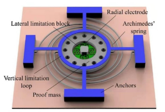 Xi et al. [19] presented a novel MEMS omnidirectional inertial switch consisting of a proof mass and an axial and four radial flexible electrodes to form a dual mass–spring system. The switch had omnidirectional sensitivities in a half sphere. The switch could sense an acceleration range from 380 g to 500 g. Liu et al. [52] presented a MEMS-based low-g inertial switch that consisted of an annular proof mass suspended by a helix spring. The helix spring could sense a weak signal. The acceleration threshold was 20 g. Yang et al. [53] designed a multidirectional-sensitive inertial microswitch with an electrophoretic flexible composite fixed electrode to enhance the contact effect. The contact time of the switch was prolonged because the new vertical composite fixed electrode was capable of reducing the stiffness, and the threshold was around 70 g, which was uniform in different sensitive directions. The fully axisymmetric serpentine spring was used to support the sensitive mass to sense any radial acceleration in the xoy plane. The T-shaped cantilever with a maple leaf shape on the top was used as a vertical fixed electrode, which could monitor the acceleration of the z-axis. Du et al. [54] studied a low-g omnidirectional microswitch via non-silicon surface micromachining technology, and the distribution of the threshold acceleration was uniform. The device consisted of combination of an annular-shaped proof mass and supporting Archimedes spiral springs as the moving electrode and static electrode located in the center of the ring. The structural sketch of the proposed inertial switch is shown in Figure 4. The threshold acceleration of the switch dropped to 38 g. Moreover, they improved the design, redesigning the structure of the central springs [55]. The switch adopted an S-type flexible connection that could reduce the stiffness of the electrode to extend the contact time of the switch. The dynamic threshold of the switch was 7.9 g to 11.3 g, and the response time in each direction was less than 2 ms. Chen et al. [56] designed an omnidirectional inertial switch with a rectangular spring. The omnidirectional switching system’s stability was reinforced, due to the design of rectangular springs. The threshold acceleration of the designed inertial switch was about 58 g in the x direction and 37 g in the z direction, and the contact time was about 18 µs. A summary of some examples of typical sensitive direction inertial switch performance is shown in Table 1.