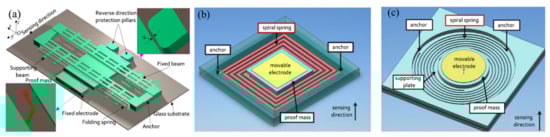 - Riaz, K.; Iqbal, A.; Mian, M.U.; Bazaz, S.A. Active gap reduction in comb drive of three axes capacitive micro accelerometer for enhancing sense capacitance and sensitivity. Microsyst. Technol. 2014, 21, 1301–1312. [Google Scholar] [CrossRef]