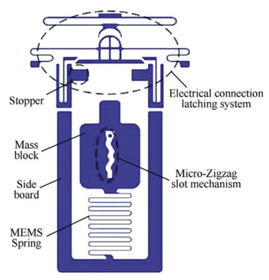 Nie et al. [64] presented a MEMS high-g electronic inertial switch for medium- and large-caliber projectile fuses. This switch mainly consisted of four parts: a zigzag groove in the center of the sensitive mass, a latch, an electrical connection structure, and a movement-limiting mechanism, as shown in Figure 6. The zigzag groove had a damping effect on the mass movement, which had the function of sensitively distinguishing the fuse launch acceleration and accidental fall shock. The switch could withstand accelerations of 3000 g. A method for identifying the acceleration load of the zigzag groove of the mass block was established, which was of great significance for the parameter optimization of the switch structure under different accelerations. Singh et al. [65] designed a passive high-g inertial switch for critical applications without electricity. The switch consisted of a serpentine spring–mass system, the dimensions of which were optimized for the natural frequency [66], and the switch was closed at 3500 g acceleration. Xu et al. [67] presented an inertial microswitch with synchronously following flexible electrodes, and its spring-shaped structure was used not only to prolong the contact duration but also to reduce shock bounce. The switch achieved a contact time of 350 us at 500 g acceleration. Xi et al. [68] proposed a high-g inertial switch consisting of five individual electrical switches and a sensitive mass–spring system. This switch could detect not only the acceleration threshold, but also the direction of acceleration in three-dimensional space. The contact time of the switch was 119 μs when the acceleration shock was 1200 g.