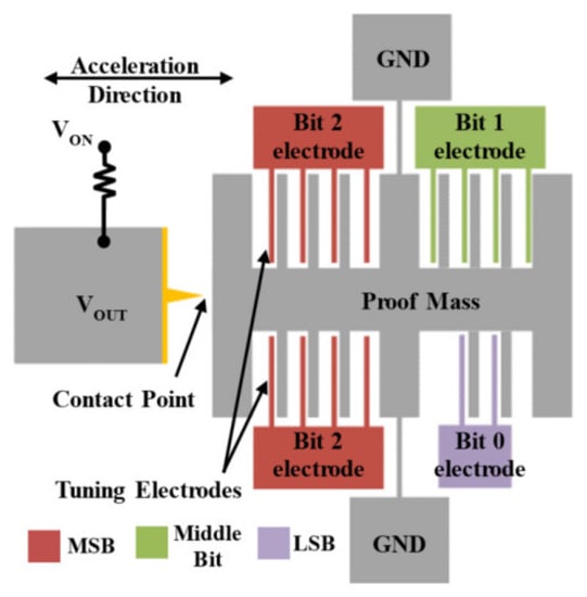 If the threshold acceleration of the inertia switch is adjustable, its application can be extended to a wider range of environments. Kim et al. [12] designed a bidirectional adjustable acceleration switch that could simultaneously increase and decrease the threshold acceleration in the same mechanism. In their previous paper [69], they proposed a tunable acceleration switch, but the switch design could not decrease the threshold acceleration and the tunability was limited. It could be used in secure/armed position switching and mechanical locking adjustable switches for military applications. Threshold acceleration could be increased or decreased by electrostatic forces created by the electrical potential between the contact portion and the comb structure. The threshold acceleration without tuning voltage was 10.25 g, and then it was tuned to 2.0 g and 17.25 g by applying 30 V to the push and pull combs, respectively. Subsequently, a fully digital MEMS accelerometer was implemented using the concept of a MEMS accelerometer switch [70]. The accelerometer consisted of a proof mass and a number of parallel plate electrostatic actuators that could be turned on and off in a sequential manner by a digital controller (as shown in Figure 7). By changing the bias voltage and working voltage of the electrode, the full-scale acceleration and acceleration range of the most significant bit and least significant bit could be set to any value, thereby adjusting the acceleration range of the device. This design realized the adjustment of threshold acceleration between 0 and ~1 g. Ma et al. [71] presented an inertial switch with adjustable acceleration thresholds based on a MEMS digital-to-analog converter (M-DAC). The selected adjustable plates were pushed by diverse PDMS caps to produce a specific displacement of the sensitive mass, thus realizing the adjustment of the acceleration threshold. By using different upper PDMS caps, the acceleration thresholds changed between 40 g and 75 g. Abbasalipour et al. [72] expanded on the original design of the fully digital MEMS accelerometer and designed a micromechanical accelerometer with 8-bit digital control. The tuning force of each electrode group was three times that of the adjacent electrode group. The full-scale acceleration of the tested 8-bit prototype was 2.7 g. Table 2 shows a summary of some examples of typical threshold acceleration inertial switch performance.
