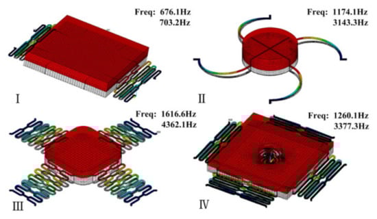 Modal analysis of various microswitches and their first two frequencies. Type I adopted a vertically driven structure with low off-axis sensitivity. Type II and III used a fixed contact point on the proof mass. Type IV realized a longer duration contact with a movable contact point.