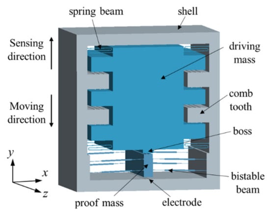 Additionally, the concept of a bistable mechanism has been brought to micro-inertial switches [85,86], which utilizes a bistable post-buckling structure to achieve a similar latching function. Taking advantage of the ability of the bistable mechanism to maintain two bistable positions without consuming power, the bistable structure has great superiority in designing an inertial switch with a self-locking function. Sandia National Laboratories presented a fully compliant bistable microswitch with a tapered beam in [87] and a three-segment bistable inertial switch [23] consisting of a large mass suspended on the four bistable beams, which could achieve the on-off function of a high g-value acceleration. Bistable microstructures as nonlinear elastic spring elements to precisely define two static stable states have been involved [25]. However, bistable structures have not been used to decrease the contact resistance. To reduce the contact resistance, a novel magnetic actuated bistable acceleration switch was proposed in [26], which included an asymmetric bistable mechanism with a parallel beam and three magnets arranged three-dimensionally. Zhao et al. [88] presented a wireless inertial microswitch incorporating a bistable flexible mechanism. When the bistable structure underwent buckling deformation under an excitation of external acceleration, the proof mass at the contact position could be stabilized. Liu et al. [89] studied a novel low-g MEMS bistable inertial switch with dual self-locking functions under an 8 g acceleration and reverse unlocking under a 105 g acceleration threshold, which was expected to carry out the reuse of the switch. The schematic of the designed bistable inertial switch is shown in Figure 9. This switch used a fully mechanical structure to greatly improve the anti-electromagnetic interference ability.