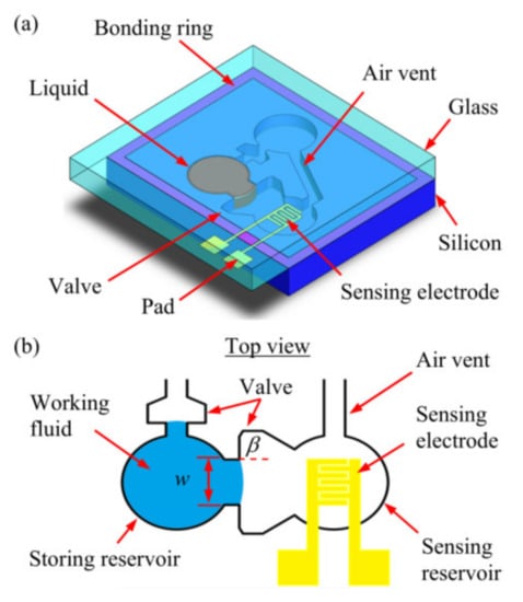 Yoo et al. [91] designed an inertial switch with a liquid–metal contact method, which greatly improved the stability of the switch contact. Kuo et al. [28] designed a passive inertial switch and integrated an L-C resonator to realize wireless signal transmission. The working fluid was water. In another design [92] introducing multiwall carbon nanotube (MWCNT)-hydrogel composite material, they proposed a liquid-type inertial switch integrated with a passive inductor/capacitor (L-C) resonator. This switch could achieve various threshold levels of acceleration by various channel configurations. Huang et al. [27] designed a microfluidic time-delay switch. The device consisted of glycerol (as the working fluid), a microcapillary valve (as the time-delay mechanism), and sensing electrodes. The schematics are shown in Figure 10. By changing the geometric design of the microfluidic system (such as channels and valves), the delay time of the microfluidic switch could be easily adjusted. The experimental test showed that the delay time range of the switch was 4.1 to 10.9 s.