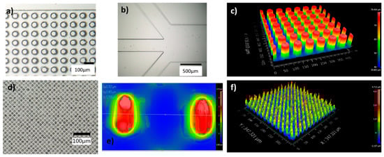 The fabricated posts and side channels are shown in Figure 2. The posts are individually formed, and no defective area is observed. The posts are not tilted or stuck together. The side walls also show smooth surfaces and the corners of the side channels towards the outlets (Figure 2b) are nicely formed. In addition, the flow was assessed via fluorescence microscopy that showed uniformity across the entire channel from the inlet to the outlets, as shown in Figures S1 and S2.