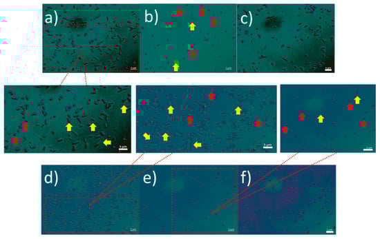 Fluorescence microscopy images of wild-type cells at 50 µL/min flow rate for Chip A at the L1 (a), L3 (b) and L2 (c) outlets and Chip B at the L1 (d), L3 (e) and L2 (f) outlets. The yellow arrows show the wild-type cells larger than 1 µm while the red arrows point to the wild-type cells that are equal to or smaller than 1 µm.