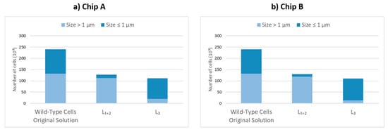 Number of wild-type cells in the solution prior to separation and the ratio of cells categorized by their size at the indicated outlets for (a) Chip A and (b) Chip B.