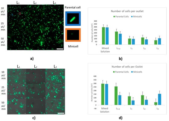 (a) Fluorescence microscopy image of cells at outlets L1, L2 and L3 of Chip A, flow rates 10, 25 and 50 µL/min respectively at rows a, b, and c; scale bar 25 µm. (b) Number of parental cells and minicells in the mixed and pure solutions for Chip A. (c) Cells at outlets L1, L2 and L3 of Chip B, flow rates 10, 25 and 50 µL/min respectively at rows a, b and c; scale bar 25 µm; (d) Number of parental cells and minicells in the mixed and pure solutions for Chip B.