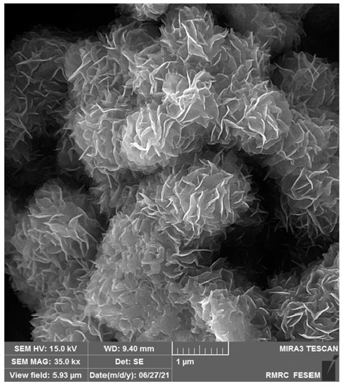 A scanning electron microscope was employed to capture images for the exploration of the morphology of MoS2 nanostructures (Figure 1). The MoS2 nanostructure is composed of thin sheets and the sheets are slightly curved and look like clusters composed of randomly assembled NSs. Moreover, SEM images show that the as-prepared MoS2 has a sheet-like morphology of about 12.8 nm thickness.