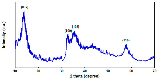 The XRD spectra was captured to determine the crystallographic structures of MoS2 NSs. Figure 2 shows the crystallite properties of MoS2 NSs based on the XRD spectra profiled at 57.8°, 35.3°, 32.22°, and 13.66° attributed to (110), (103), (100), and (002) crystal planes of the MoS2 structure, respectively, in line with the relevant standard card (JCPDS card No. 37-1492). There were no peaks related to any impurity or other phases [53].