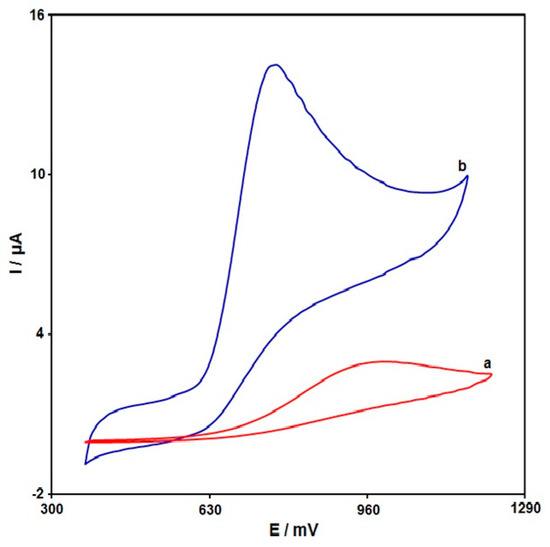 The CV curves for (curve a) unmodified SPE, and (curve b) MoS2 NSs-SPE in PBS (0.1 M) spiked with INZ (200.0 μM) at the scan rate of 50 mV/s.