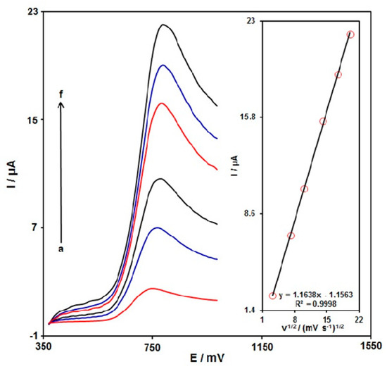 Figure 5 shows the use of LSV to determine the scan rate influence on the INZ oxidation electrocatalytically on the MoS2 NSs-SPE. As seen in Figure 5, the peak potential of oxidation was towards more positive directions by elevating the scan rate, which means the kinetic restriction in electrochemical process. The peak height (Ip) plot versus the scan rate square root (ν1/2) was linear ranging from 10 mV/s to 400 mV/s, which means the diffusion process is the main mechanism.