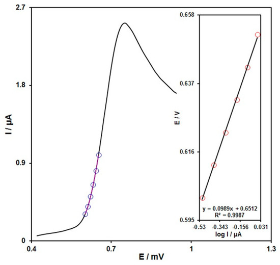 To study the rate-determining step as shown in Figure 6, the data related to the rising section of current vs. voltage curve obtained at 10 mV/s scan rate were applied to draw a Tafel plot for 100.0 μM of INZ. The linearity of E versus log I plot reveals the kinetics of the electrode process. The slope obtained from this plot was utilized to compute the electrons transfer number in the rate-determining step. Figure 6 illustrates the Tafel slope of 0.0989 V for a linear part of the plot, underlining the rate-limiting step of one-electron transfer having a transfer coefficient (α) of 0.4.