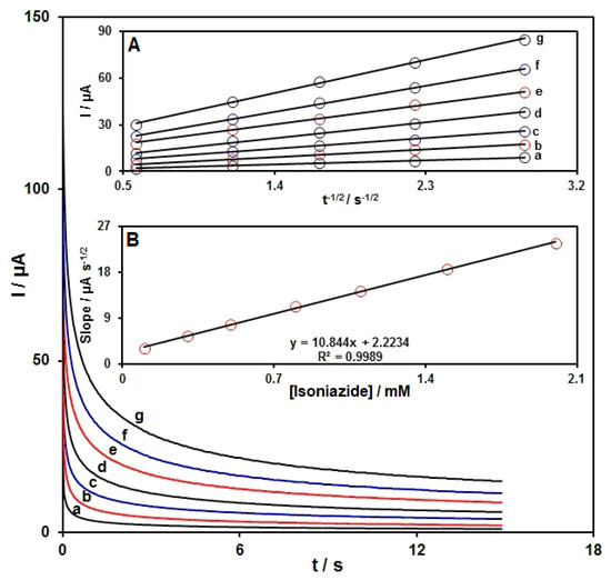 The chronoamperograms obtained on MoS2 NSs-SPE in PBS (0.1 M, pH = 7.0) for various INZ contents; a–g: 0.1 mM, 0.3 mM, 0.5 mM, 0.8 mM, 1.1 mM, 1.5 mM, and 2.0 mM of INZ, respectively. Inset (A): the plot of I against t−1/2 seen by chronoamperograms from a to g. Inset (B): the slope from the plot of straight line against INZ content.