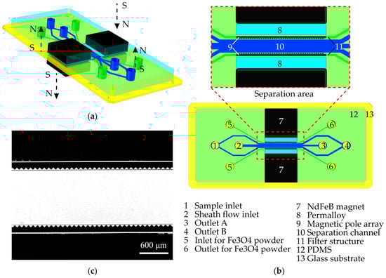 The fabrication of the system was divided into two steps. The first step was to fabricate a conventional microfluidic chip using soft lithography. The height of all microchannels was 50 μm, the width of the two sample inlet channels was 100 μm, the width of the sheath flow inlet channel was 1000 μm, the width of the separation channel was 1200 μm (as shown in Figure 1b), and the width of three outlet channels at the end was 400 μm. The second step was to build a high-gradient magnetic field structure on the chip. The Fe3O4 powders (5–10 μm in diameter) mixed with ethanol were first injected into the magnetic pole channels to form the magnetic pole arrays. The width of the magnetic pole channels on both sides was 100 μm, and the distance from the tip of the magnetic pole to the separation channel was 10 μm. Then, the permalloy (1J85, 30 μm in thickness, Dongguan Saijing Special Alloy Co., Ltd., Dongguan, China) was embedded in both sides of the magnetic pole arrays; here, we reserved a permalloy embedded channel (26 mm in width and 50 μm in height) on the sides of the magnetic pole arrays, so that the rectangular permalloy could be precisely embedded in both sides of the magnetic pole arrays under the microscope. Finally, the magnets (N52, 25.4 mm × 12.7 mm × 3.175 mm) were added to the chip through a fixed mold. The distance from the permalloy to the magnetic pole channel was 30 μm, and the length of the magnetic pole array was 26 mm.