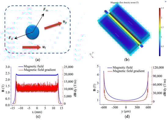 When particles are transported through the microchannel, they flow forward under the hydrodynamic drag force , and the negative magnetophoretic force acts on the particles when they enter the separation area, as shown in Figure 2a. The hydrodynamic drag force is described by the following equation [32]: